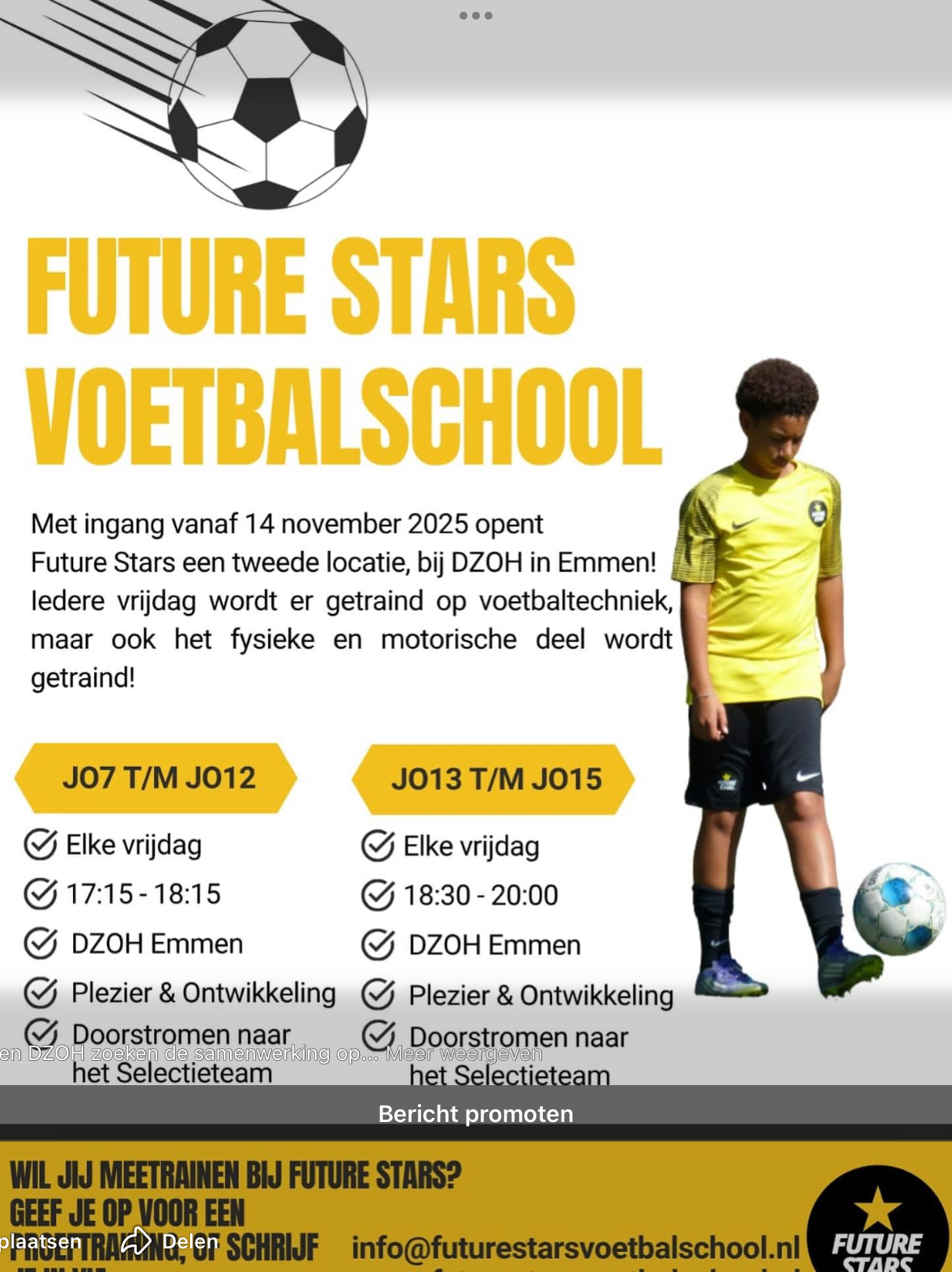 Al met al zijn zowel Future Stars als DZOH erg enthousiast over deze samenwerking. De eerste training is op 14-11-2025 en we hopen hier zo veel mogelijk kinderen te mogen ontvangen. Voor leden van DZOH zijn deze trainingen dus gratis. Meld je vooral aan!